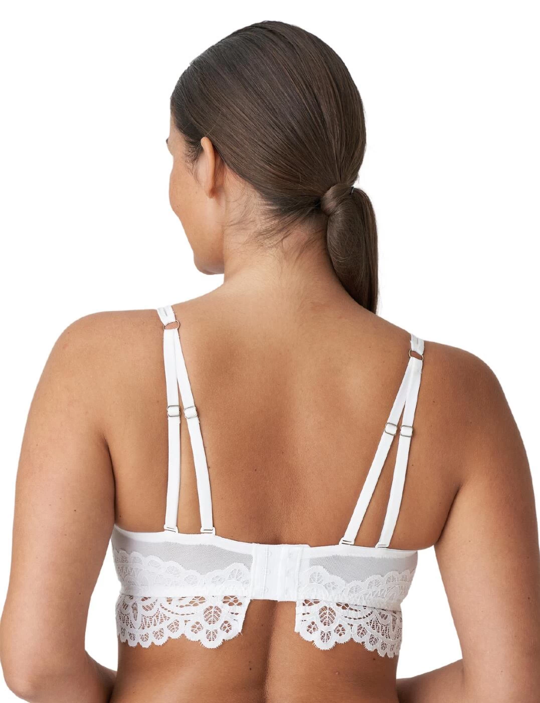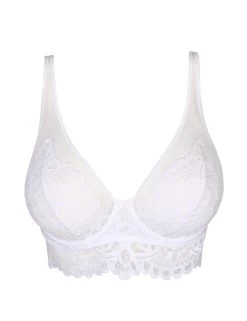 A feminine and flattering piece brought to you from the First Night collection by Prima Donna Twist. This longline bra extends lace down your torso for an attractive feature. This lace continues on the cups, tapering up the straps, layered over mesh. The widened straps at the front provide an anchorage to the piece, relieving tension. Underwiring on the cups provides a rounding to the bust as well as security within the piece. Combined with padding it provides a forward projection and a softened feeling against the skin. The plunging neckline flawlessly highlights the uplifted cleavage. The straps at the rear split into two to create a stunning double strap style, both are fully adjustable to allow you to find your perfect fit. The lace splits at the hook and eye closure for a dainty touch to expose more of your back.