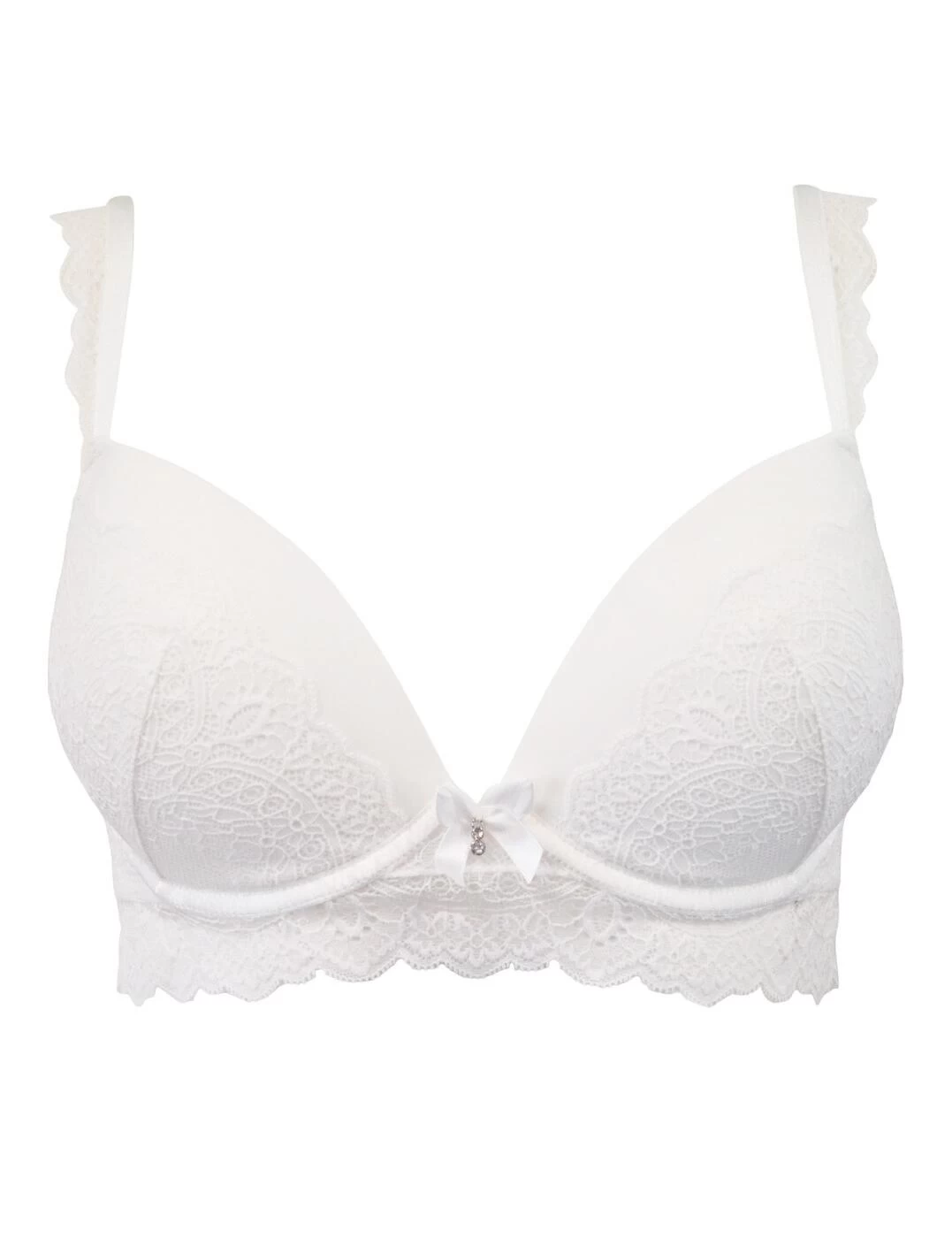 The Divine collection by Pour Moi is effortlessly glamourous. This push-up bra boasts padded cups to give you added volume which is highlighted by the deep plunging cups. Opulent lace adorns the cups and band of this bra. Underwiring offers a supportive fit and natural lift. A soft scalloped lace flatters the body and gives an ultra-feminine appearance. Adjustable shoulder straps and a hook and eye closure allow you to find the perfect fit. Finished with a charming bow holding a charm on the bridge. Pair with matching lingerie from the collection for a coordinated look.